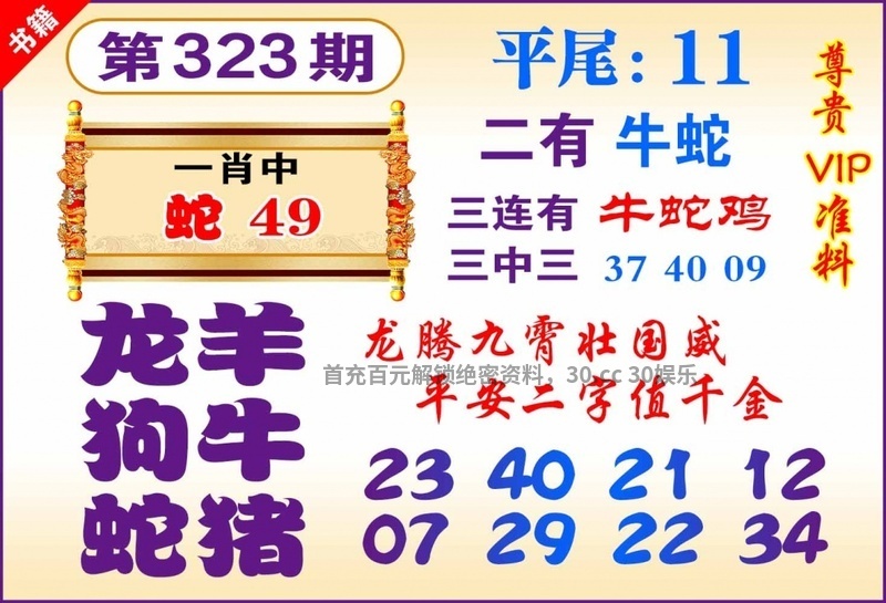| 323期:九肖【牛鸡蛇兔猪狗马羊猴】开:鸡09准 |